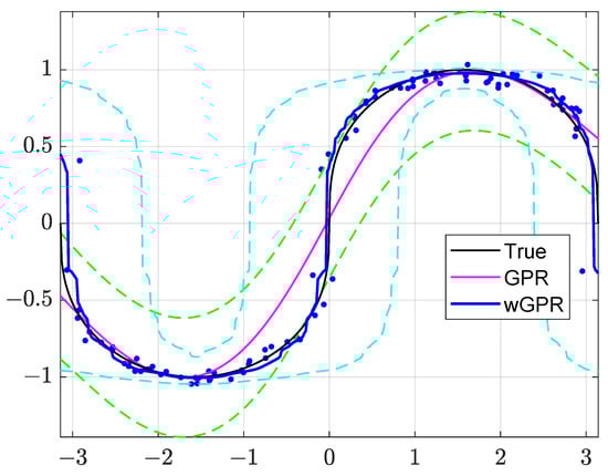 The process is approximated using GPR and wGPR. The performance of the reconstructions is evaluated by comparing the regression estimates with a sample at uniformly distributed validation points in . In the case of GPR, the point predictions are obtained from the marginal posterior mean, Equation (5), the uncertainty is determined from the posterior covariance, Equation (6), and prediction intervals are calculated according to Equation (7) with . In the case of wGPR, the prediction and the 95.45% predictive intervals are obtained from Equations (10) and (11) respectively.