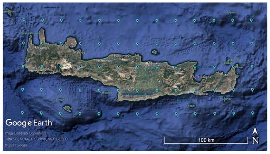 - Google Earth Pro 7.3.4.8248. (14 December 2015). Crete island, Greece, 35°16’12.97"N, 25°1’25.14"E, Eye alt 273.94 km. SIO, NOAA, U.S. Navy, NGA, GEBCO. Image Landsat/Copernicus. Available online: https://earth.google.com/web/ (accessed on 13 April 2021).