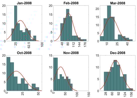 Distribution of monthly precipitation during the wet season of 2008. Histograms are based on ERA5 precipitation data at 65 grid locations over and around the island of Crete. Best fits to the optimal Gaussian PDF models (red line) are also shown. The vertical axis of the histograms represents frequency; the horizontal axis represents precipitation amount measured in mm.