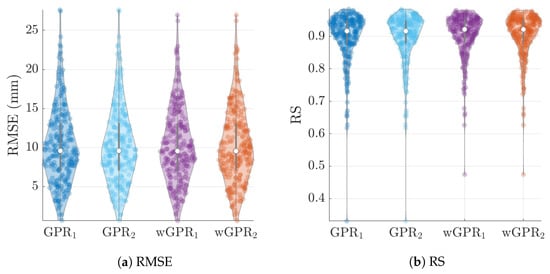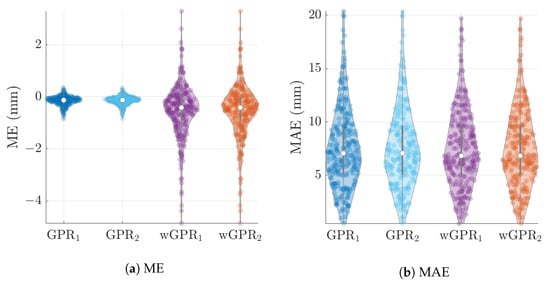 Cross-validation metrics for GPR and wGPR based on the validation set of 400 points from the function of Equation (16). ME: Mean error. MAE: Mean absolute error. RMSE: Root mean square error. RP: Pearson’s correlation coefficient. NS: Nash-Sutcliffe coefficient. ErrMin: . ErrMax: .