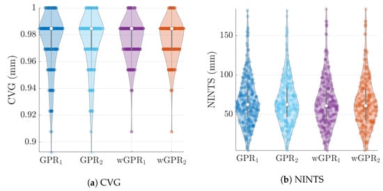 The distribution of LOO-CV metrics are shown in the violin plots of Figure 6, Figure 7 and Figure 8. Each violin plot is generated by 246 values (6 months × 41 years) of the respective LOO-CV metric which is calculated based on the 65 values at the grid nodes. The LOO-CV metrics used include the mean error (ME), the mean absolute error (MAE), the root mean square error (RMSE), and the Spearman correlation coefficient (RS). In addition to these, we also use two-interval scores (see Appendix B): the interval coverage (CVG) and the negatively oriented interval score (NINTS) []. Negatively oriented scores imply that lower scores correspond to better predictions.
