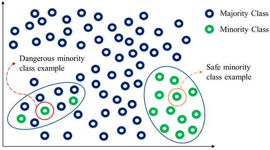 To be brief, when a minority class example is surrounded by most of majority class examples, it is called the dangerous minority class example. On the contrary, it is called the safe minority class example as shown in Figure 1.
