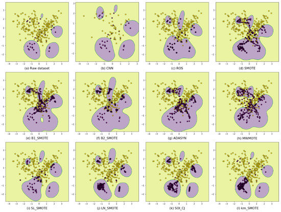 Classification results using different resamplers. (a) the raw imblanced dataset; (b) using CNN; (c) using ROS; (d) uisng SMOTE; (e–h) using danger-information-based oversamplers; (i–l) using safe-information-based oversamplers.