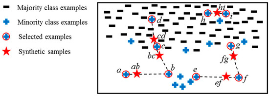 - Resampling techniques. Here, the aim is to balance the class distribution by removing majority class examples (undersampling) or by inflating minority class examples (oversampling). Since the synthetic minority oversampling technique (SMOTE) [24] was proposed in 2002, it has become one of the most influential data preprocessing/oversampling techniques in machine learning and data mining. To improve the SMOTE, undersampling techniques e.g., condensed nearest neighbor (CNN) [25], Tome lines [26], etc. were used after the oversampling. SMOTE_IPE [27] is another combined resampling method. It uses an iterative-partitioning filter [28] to remove noisy samples in both majority and minority classes to clean up boundaries and make them more regular. Li et al. [29] used the mega-trend-diffusion technique [30] for undersampling and used a two-parameter Weibull distribution estimation for oversampling in their work. A more improved oversampling technique will be introduced in Section 2.