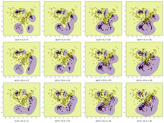 To illustrate the strengths of the proposed BIBO, the imbalanced dataset shown in Figure 2a is applied to be oversampled by using the BIBOs with different values of K and k. Then, they are trained and classified using the same SVM classifiers. The classification results are shown in Figure 4, where from top to bottom, the K values increase from 5 to 15, and from left to right, the k values increase from 5 to 30. From the figures, this paper finds that when both the K and k are small (see Figure 4a), the BIBO is conducted like SIBOs; when the K increases from 5 to 15, the areas predicted to be positive (PPAs) are larger, and some separated PPAs are merging, as the kNPNs become larger and generate virtual samples inside them; when the k increases from 5 to 30, the PPAs become larger and start to intrude into the majority class areas as the old noises in the overlapping areas become fewer in number. However, even though both K and k are large enough, as shown in Figure 4l, the synthetic samples are still near the decision boundaries. Therefore, the BIBO has a great tolerance for parameter value settings.
