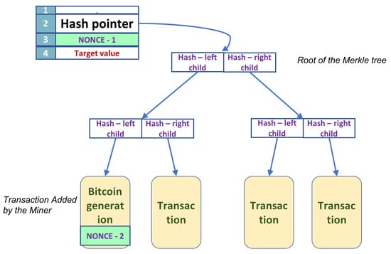 Section 3.1. Nonces appear in the block header and in a leaf of the Merkle tree. Golden nonces, or successful nonces, have to satisfy a condition; namely, the hash value of the block header has to fall within a range. Any change to either of the two nonce values affects the value of the overall hash. When the primary nonce in the block header changes, the hash is easily recomputed. In contrast, changes to the extra nonce, in the leaf of the tree, require the recalculation of parts of the Merkle tree, and thus the recalculation of the hash requires a time complexity dependent on the height of the tree.