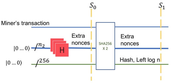 In the first stage, we prepare the input to the quantum circuit. We treat each state as equally likely and consider a superposition of all the states. The number of bits in extra nonce is