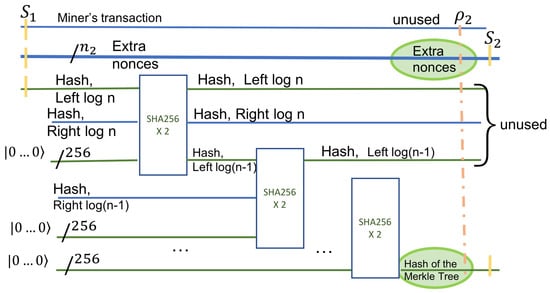 ) that holds the miner’s transaction data. The miner’s data refers to the miner’s Bitcoin identity, the address, and the value in bitcoins rewarded for the block creation. This data is classical yet inputs into a quantum circuit. After concatenation of two registers, the set of all possible states is shown by tensor product, denoted by ⊗. The circuit in