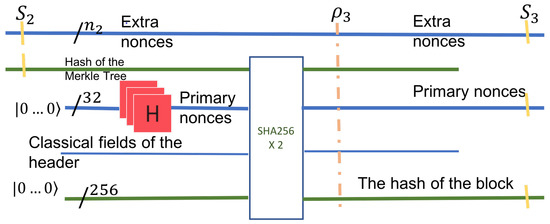 In particular, the size of the search space is given by the three registers: the header-nonce is of size 32, the size of the extra nonce, , and the block-hash is of size 256. The hash’s size does not contribute to the search space, as it is dependent on the nonces. The two types of nonces are independent and thus define the search space’s size, which is . The state given by these three registers is mixed but describes the system as seen by the Grover circuit in this step,