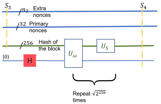 The next step computes the hash of the 4-tuple, given the nonce in the block header. The subsequent step is the use of Grover’s algorithm. The final step is the measurement, which identifies the two nonce values with sufficiently high probability (