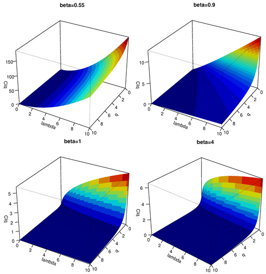 3D plots of the CRQF information measure in (12) for some selected choices of the Weibull parameters.