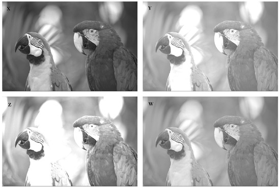 Next, we provide an example of image processing and compute the CRQF information and Fisher information (FI) measures for the original picture and its adjusted versions. Figure 2 shows a sample picture of two parrots (original picture) labeled as X and three adjusted versions of the original picture labeled as Y (increasing brightness), Z (increasing contrast), and W (gamma corrected). The available data of the main picture are