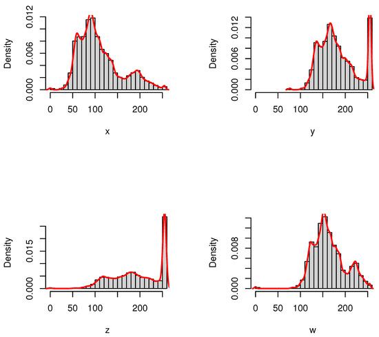 The histograms and the corresponding empirical densities for pictures X, Y, Z, and W.