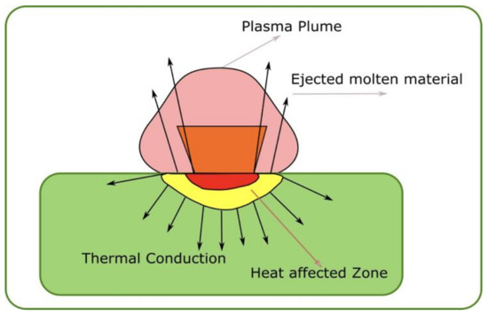 In Figure 1, the simplified block diagram of the laser–material interface is drawn. Here are found the most important areas, such as entitled plasma plume and heat-affected zones closely related to the thermal conduction zone. These areas are well demarcated and colored differently, e.g., the plasma plume area has a dark pink color, the thermal conduction area has a green color and the heat-affected area has a yellow color.