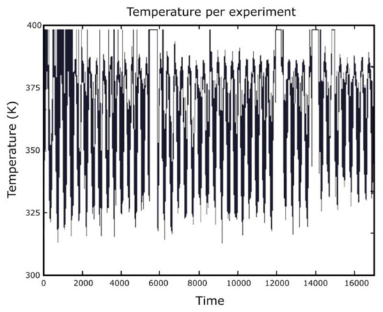 In Figure 2, a time series of absolute temperature (time-dependent temperature) is shown, and the superscript on the graph refers to the temperature per experiment. On the abscissa (ox axis), we have the time t (seconds), and on the ordinate (oy axis), we have the absolute temperature T (Kelvin).