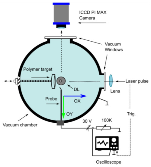The tests were conducted in a vacuum chamber, built entirely of stainless steel and rapidly ejected by the ability of a 450 L/s turbo-molecular automatic pump device to a base pressure smaller than 10−6 torr (p < 10−6 Torr). As a necessary maneuver for the experimental process, it was then intervened by a 10 ns Nd: YAG laser and pulsed laser beam (with the wavelength λ = 532 nm), which was focused by a lens with focal radius f = 25 cm on the polymer target (the polymer composition is presented in the continuation of the paragraph) placed in the same enclosure as the vacuum chamber. The rough dot size in the percussion place was approximately 300 × 10−6 m (~300 µm).