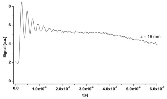 In Figure 6, the transient ionic current, labeled signal on the graph, more precisely the transitory ionic signal (or ionic current intensity) registered by the Langmuir feeler/probe device placed at an established remoteness/length, perpendicular to the polymer target surface, is presented.