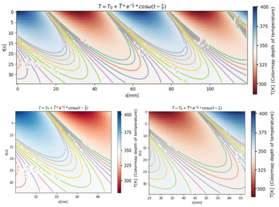 In Figure 8, the estimation of the temperature function of t (time) and x (position in the probe) is presented. In the 3D graphs, the value of temperature is specified by a colormap bar.