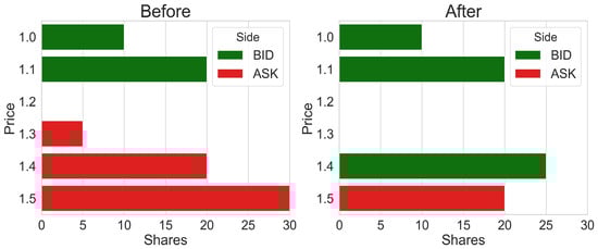 The highest price at which buyers are willing to buy a security and the lowest price at which sellers are willing to sell a security collectively comprise the “bid–ask” layers, which are the uppermost layers and represent the current market price of a security. Additional layers are price points that are further away from the bid–ask. Each layer consists of a price and volume. The bid–ask layers change continuously throughout the day based on supply and demand, resulting in shifts in the security’s market price. For instance, a flow of buy orders can exhaust the volume available in the uppermost ask layer. This would uncover the next available layer on the ask side, making this layer the new ask market layer and thereby raising the stock price. Thus, the limit order book contains hidden data that may become visible throughout the trading day (see Figure 1 for an example).