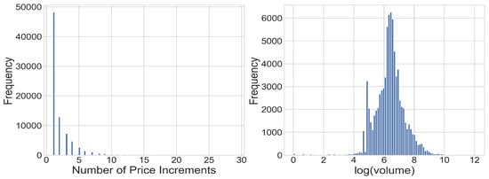 An example of the distribution of price increments and log(volume) for one order book layer of ALHE in 2017. The number of price increments are a count of the minimum interval in price set by TASE from the best bid and best ask. For instance, if the best bid is 7 and the increment is 0.10, a price of 7.30 would appear as 3. This illustrates that price differences are discrete, having specific values with some rare ones, while the log(volume) is approximately continuous in nature.