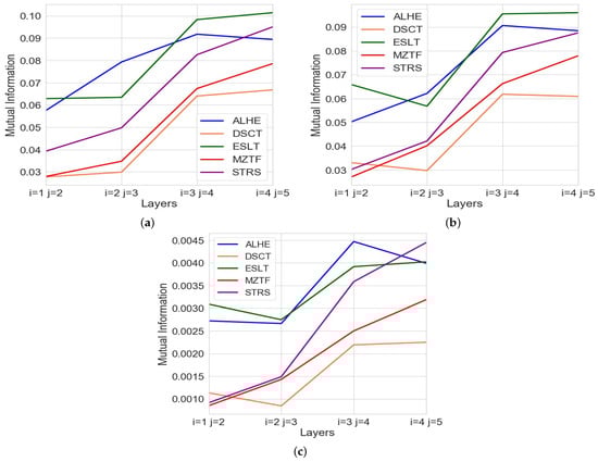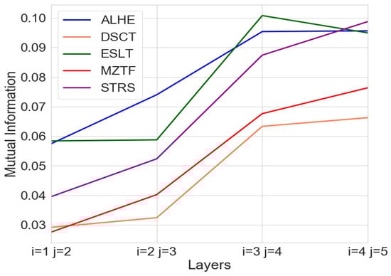 Rather than measuring the efficacy of the deep layers in forecasting of particular trading measures, we examine the mutual information (MI) between the layers. Entropy and MI have been previously applied in financial data, as described in the a review by Zhou et al. []. Specifically, Cai et al. [] and Almog and Shmueli [] use entropy to study the effect of auto-correlations in stock and FOREX time-series. Avellaneda [] and Avellaneda et al. [] used minimum relative entropy to fine-tune pricing models. Sakalauskas and Kriksciuniene [] combined Shannon’s entropy with Hurst exponents to forecast changes in stock price trends, while Kim et al. [] combined effective transfer entropy with machine learning models to forecast changes in the direction of stock prices. In Dionisio et al. [] and Darbellay and Wuertz [], MI is applied to stock market indexes. Two papers specifically studied the MI between securities traded on the NYSE (Fiedor []) and Shanghai Stock Exchange (Guo et al. []). Both works found that the MI method yields different results compared to correlation coefficients. These findings suggest the existence of nonlinear relationships in financial markets.