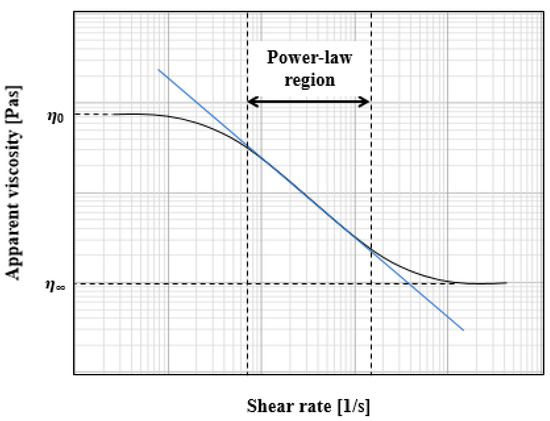 where is the apparent viscosity, K and m are the consistency and flow behavior index, respectively. The fitted parameters in the shear rate range of 0.067 s−1 < < 860 s−1 were K1 = 1.75, K2 = 14.99, K3 = 115.34 Pa·sm, m1 = 0.464, m2 = 0.388, m3 = 0.325, which yielded R21,2,3 = 0.994, 0.996, 0.995, respectively; the regression process that obtained the K and m are seen in the Table 2 and Figure 2.