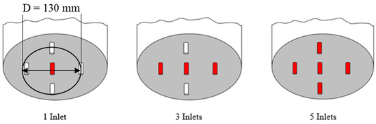 During the experiments under gassed conditions, compressed air was sparged through five orifices in the tank bottom. Three arrangements of air sparging were investigated as shown in Figure 3. Air was introduced via a tube equipped with a certain number (1,3 and 5) of 2.0 mm orifices and the opening of orifices were controlled by an air distributor. The four orifices were evenly distributed on the circumference a diameter of D/3 (as seen in Figure 3). Gas flow rates were set as 5, 10, and 15 L/min. The flow meter was controlled by a Labview program, which regulates the volumetric flow rate of the gas. For the measurement, the flow rate was kept at a constant value, and the rotational speed of the turbine was varying from the maximum to minimum.