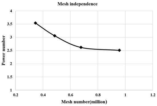 The commercial CFD software ANSYS Fluent 19.1 was applied to model the hydrodynamics of single-phase aqueous CMC solutions and gas-CMC solution two-phase mixture in mixing tanks stirred by a curved-blade Rushton turbine. The tank geometry for the two-phase flow were modeled directly in the meshing software, and the sparger system configuration of the gas-liquid mixture, five small cylinders of 15 mm length and 2 mm diameter were modeled at the tank bottom. The 3D calculation domains were imported in ICEM CFD for meshing and pre-processing. Hexahedral structured grids of all parts were generated, in order to have higher accuracy of the numerical calculations. The structured mesh of the whole impeller after mesh rotation of the mesh is shown in Figure 4. The sufficient amount of mesh nodes was created in the rotor zone including the gas sparger inlet to have a much-fined mesh. To verify the mesh independence, the number of cells was increased from the original 345,100 to about 485,000, 676,200, and 956,970 cells, respectively, as seen in Figure 5. These increases changed the velocity and power number in rotor region by less than 3%, however, the calculation time were around 20, 30, 50 h, respectively. Finally, to save the calculation resource, the number of 676,200 cells were employed to numerical simulations.
