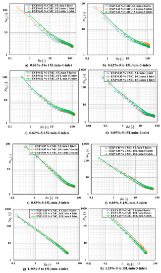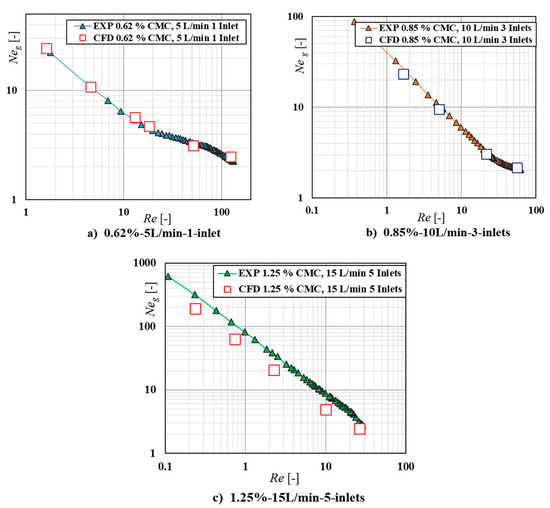 To enhance accuracy in the results presented in the investigation, the validation of power consumption has been conducted under different sampling frequency. The uncertain analysis of repeatability for devices test has been investigated by the relative uncertainty, which was defined as the ratio of standard deviation to mean value. Figure 6 shows the variation of power consumption of gas flow rates, inlet distributions and fluid concentration at different sampling frequency. The logarithmic plots of the gas-liquid power number vs. the Reynolds number Re are used to compare with the experimental data and CFD predictions. Figure 6a–c shows three cases of power curves with three fluids concentrations, flow rate and inlet distributions used in this work. Since for each concentration, there has many combinations of inlet distributions and gas flow rates. Hence, the CFD predictions of 0.62%, 5 L/min 1 inlet and 0.85%, 10 L/min 3 inlets as a random sample were present here for discussion. The standard deviation bar for the experimental testing fluids is also shown. The differences between CFD and experiment measurement of the power consumption were within ±3.42%, ±5.10%, respectively. A good agreement of the simulation and experimental results is also observed. However, for 1.25%–15 L/min-5 inlets case, the predicted results were lower than the experimental results in the whole range of Re. The reason can be that the higher concentration fluids has higher viscous force, which hold the gas within the mixing tank, but the CFD result did not take this kind of viscous force into account during the simulation. Then the selected sampling frequency can be deemed to have been validated and the results to be repeatable in lower concentration fluids. The uncertainty analysis of the torque and power consumption was carried out with three repeatability experiments. When the sampling frequency is determined, each of torque and power consumption in the experimental system is determined by the average of three repeated measurements under the consideration of the uncertainty analysis of devices test. Therefore, the CFD model developed in this work is suitable for predicting the power draw of the investigated impeller in the gas-liquid mixing of lower concentration shear-thinning fluids in the laminar and the transitional region.