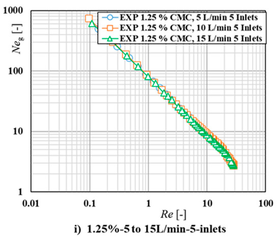 In order to investigate the effect of the sparger distribution on the impeller power draw, the gas-liquid power numbers of different flow rates in different inlet distributions were plotted against the Reynolds number in log-log scale for each case. The experiments were carried out in three mass concentration solutions (0.62%, 0.85%, and 1.25%). The gas-liquid mixture power curves of 0.62% for 1, 3, and 5 spargers distributions are presented in Figure 7a–c, respectively. In this concentration, some differences among the power curves were observed at lower Reynolds numbers. At low impeller speeds, the liquid flow generated by the impeller is weak. The gas bubbles generated at the sparger rise vertically through the impeller without any disturbance. Therefore, an increase of the power number with increasing gas flow rate for different inlet distributions was observed. However, when Re > 50, the power curves of three distributions overlapped until the end of the curves. It can be explained that for the shear thinning fluids, when the rotation of impeller reaches a specific speed, the power curves were independent with the gas flow rate and sparger distributions. The power curves of 0.85% for three inlets distributions were presented in Figure 7d–f. It can be clearly observed that the power curves completely independent with three sparger distributions and gas flow rates. The power curves of those three cases nearly overlapped in all Re region, except one point in 1-inlet case demonstrates a slight deviation. It can be explained by that with the increase of the fluid concentration, the viscous force can hold the gas bubbles, which is limited within the mixing system. Therefore, no matter which kind of inlet distribution or gas flow rates, the total density of the gas-liquid mixture is constant. It means that the circulation of the liquid is mainly generated by gas sparging. The power curves of 1.25% for three distribution cases were presented in Figure 7g–i. It demonstrated that the power curves of the three cases completely independent with the gas flow rate and sparger distributions, which means the power curves overlapped for three gas flow rates. The total density of the mixture is without significant difference with the change of gas flow rate and sparger distributions, the reason being that the power curves of different cases overlapped. However, the fluid concentration in this case is higher, which demonstrates higher viscous force, therefore, the power consumption is the highest one when compared with that of the 0.62% and 0.85% cases.