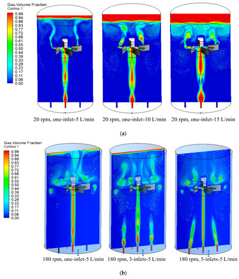 Effect of the spargers distribution on flow field in different speed and gas flow rates. (a) 0.62% gas volume fraction distribution at different flow rates when operating at 20 rpm, one sparger. (b) 0.62% gas volume fraction distribution with one, three, and five inlets at the 180 rpm and 5 L/min cases.