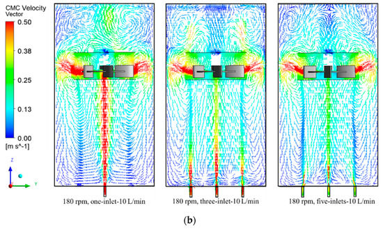 Effect of the spargers distribution on flow field in different speed and gas flow rates. (a) 0.62% CMC flow field when operating at 20 rpm and 5 L/min cases. (b) 0.62% CMC flow field when operating at 180 rpm and 10 L/min cases.