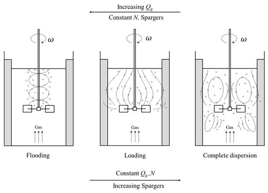 Therefore, the characteristics of the flow patterns were affected by the gas flow rate, rotating speed, and the sparger distributions. It can be generally described by three main states as shown in Figure 10. As discussed in Figure 8a, when the impeller operated at lower speed or very high gas flow rates, where the sparged gas rises through the impeller to the fluid surface without being dispersed. In this case, the impeller is said to be in a flooding state. When the gas flow rate decreased or the speed decreased to a specific value as the spargers increased, it leads to a radial discharge of the gas to the mixing tank. It corresponds to what is shown in Figure 9a, where the gas will then rise to the liquid surface. In these conditions, there is barely or no gas, which recirculated in the area below the impeller. This occurrence characterizes the transition from flooding to loading state. When further increasing the impeller rotational speed or decreasing the flow rate, the gas recirculated throughout the whole vessel, and a complete dispersion occurred. The impeller broke up the gas bubbles before they were distributed in the tank. This phenomenon at an impeller speed beyond which no further change of the flow patterns in the vessel was observed, is called complete dispersion.