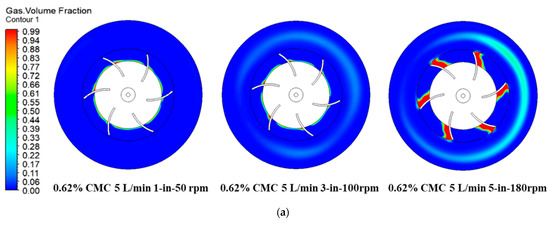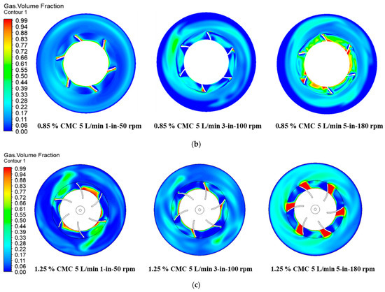 Effect of rheological properties, spargers, and rotation speeds on cavity formation. (a) Gas volume fraction distribution in 0.62%, 5 L/min with the increase of the rotation speeds and spargers. (b) Gas volume fraction distribution in 0.85%, 5 L/min with the increase of the rotation speeds and spargers. (c) Gas volume fraction distribution in 1.25%, 5 L/min with the increase of the rotation speeds.
