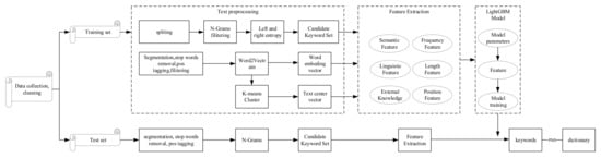 Our method is based on multi-dimensional features such as position, linguistic, length, term-frequency, external knowledge, semantic features, length, and other features to extract candidate keywords from the corpus in the disassembly field, using the LightGBM model to determine whether the candidate keyword is a keyword. Computing keywords are associated with PMI and automatically expand the domain dictionary. Figure 1 shows the flow of the entire algorithm.