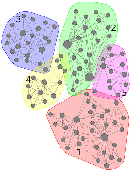 - Newman, M.E.; Girvan, M. Finding and evaluating community structure in networks. Phys. Rev. E-Nonlinear Soft Matter Phys. 2004, 69, 026113. [Google Scholar] [CrossRef] [Green Version]