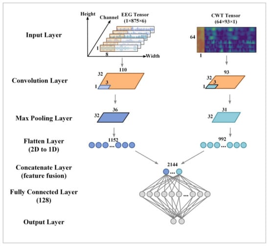 | Layer Type (EEG/CWT) | Number of Filters | Size of Feature Map | Kernel Size | Stride | Parameters |