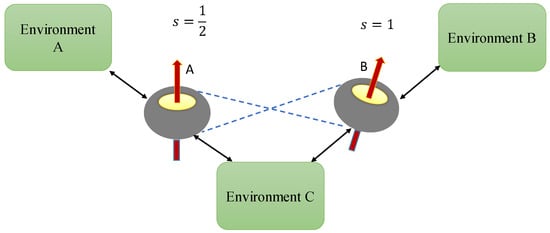 The composite hybrid qubit(A)–qutrit(B) system consists of a spin– subsystem (qubit A) and a spin-1 subsystem (qutrit B). In the following, we study the interaction of this composite system with local non-Markovian environments A and B, or with a common environment C modeling quantum or classical noises. The theoretical schematic of this system is depicted in Figure 1.