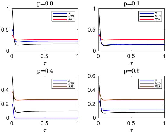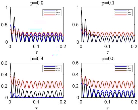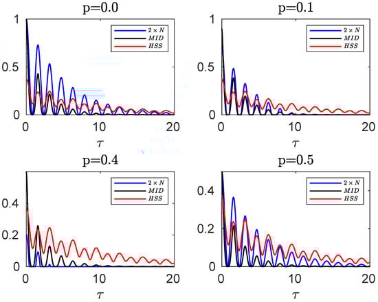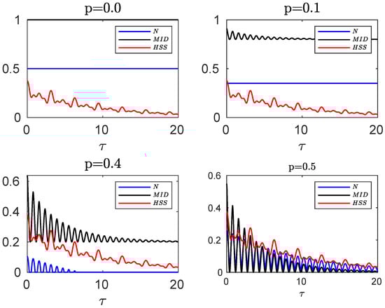 In Figure 3, we compare the evolution of HSS, obtained from the initial pure state of Equation (25), with the dynamics of negativity and MID, computed for the mixed initial state of Equation (15), for different values of p. The dynamics of the HSS is again in perfect agreement with that observed for the entanglement and quantum correlations as quantified by the negativity and MID, respectively. Therefore, the HSS-based witness, computed versus the phase parameter encoded into an initial pure state of the system, can efficiently detect the non-Markovian dynamics even in the case when the initial state of our high-dimensional system is not pure. It should be noted that in the presence of sudden death of entanglement, which occurs for some values of the entanglement parameter (for example, for ), only the HSS and MID show the same dynamics. Hence, the negativity cannot be used as a faithful witness of non-Markovianity when it exhibits the sudden death phenomenon.