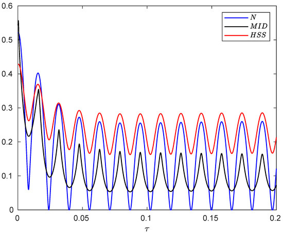 The dynamics of negativity, MID and HSS computed by the evolved state of the system are plotted in Figure 2. We find that each of the measures initially decreases with time, then starts to increase, and finally remains approximately constant over time, a behavior known as the freezing phenomenon [,,,,,,]. As discussed, the revival of the quantum correlation measures can be attributed to the non-Markovian evolution of the system []. We see that the behaviors of the HSS, negativity and quantum correlation exhibit an excellent qualitative agreement. Consequently, the HSS-based witness can precisely capture the non-Markovian dynamics of the composite system.