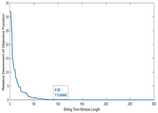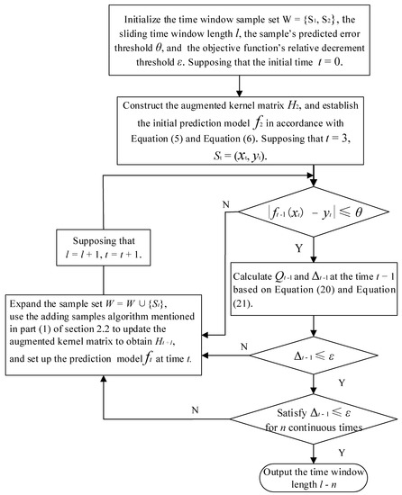 To establish the AONBLSSVM prediction model, the length of the sliding-time window for storing training data shall be determined first. If the time window is too short, fewer data will be stored, possibly leading to the consequences that the samples are not representative enough and the model’s prediction accuracy is not satisfactory; if it is too long, overfitting may occur, and the online modeling speed will be reduced [50,51]. As a result, an algorithm for adaptively selecting the length of the sliding-time window shall be designed based on data features and preset prediction accuracy.