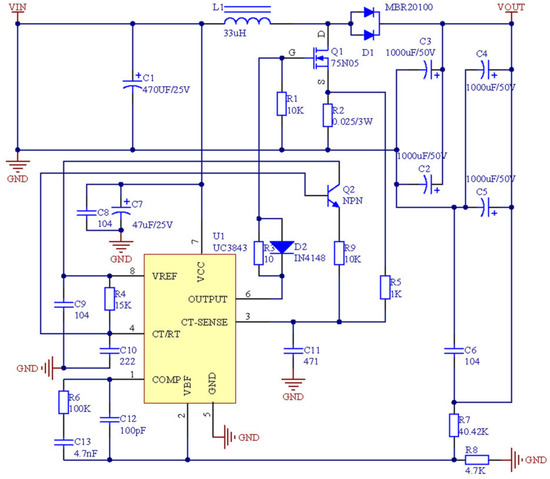The DC–DC-converter circuit designed in this study is a Boost circuit. As shown below Figure 3, the circuit achieves an input voltage of 12 Vdc, an output voltage of 24 Vdc, an , and an output power .