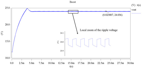 It can be known by observing the waveform in Figure 4 that the waveform of the output voltage tends to be stable when the simulation experiment is conducted for 5 ms; the output voltage fluctuates around 24 V because the DC–DC converter switches between charging and discharging modes during the working process. Consequently, its output-voltage waveform does not exhibit stable DC voltage but is found to be fluctuating, suggesting the presence of ripple voltage .