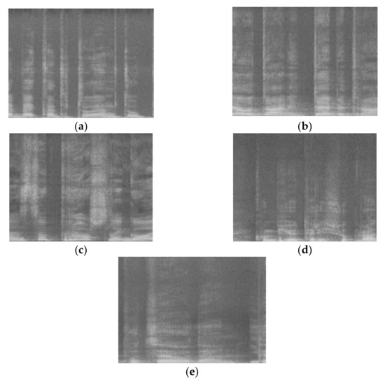 In the next step, files are divided into segments whose length is set to 1 s. If the last segment is shorter than 0.8 s, that segment is removed from the training set. If the last segment’s length is between 0.8 s and 1 s, it is extended to 1 s by replicating samples from the beginning of the segment. Each segment is then converted to the grayscale spectrogram image. Spectrograms are calculated using a 32 ms Hanning window with a time shift of 16 ms, so that there is an overlap among neighboring spectrograms of 50%. Finally, spectrogram images are saved in .png format resized to 128 × 170. Examples of created spectrograms can be seen in Figure 1.