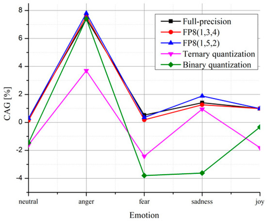 where acp represents the accuracy of the proposed model, whereas acc is the accuracy of the compared model. The positive values of CAG indicate better model performance of the proposed model. CAG values are given for all analyzed models and all emotional styles in Figure 3, providing a detailed comparison with the model from [17]. We can highlight that the proposed full-precision model provides better performance for all emotions, although the proposed network has far fewer parameters, demonstrating the suitability of rectangular kernels. By analyzing quantized CNN models, it can be seen that the proposed model would achieve better performance than the model from [17] for all emotional states in the case of both FP8 formats. However, better results in the case of ternary quantization are achieved only in the case of anger and sadness, whereas anger is the only emotional style for which better results are achieved in the case of binary quantization. Such behavior is not unusual, as the model from [17] has more than three times more parameters and the performance of low-precision models also rely on the model depth. However, more parameters and larger depth lead to longer processing and higher storage capability demands.