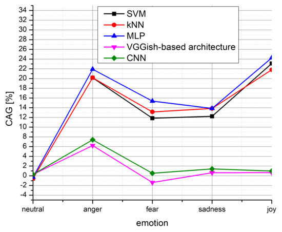 Besides comparing the proposed model with other CNN models, let us observe the achieved performance of SVM, KNN, and multilayer perceptron (MLP) on the same dataset. These results are already presented in [10]. By observing Table 3 from [10], it can be seen that these methods provide great classification accuracy in the case of neutral speech, even slightly better than the model we propose. However, when deploying such models trained to the neutral speech on other emotional styles, there exists a huge degradation, much larger than in the case of the proposed CNN model. The achieved classification accuracy gain of the proposed full-precision model compared with the SVM, KNN, MLP, and full-precision CNN model from [17] and VGGish-based architecture from [37] is presented in Figure 4.
