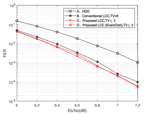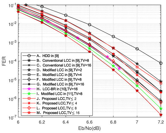 The simulation results of the proposed LCC algorithm for (255,239) RS code are given and compared with several previous algorithms in Figure 2. The proposed LCC algorithm reduces the decoding complexity by dynamically adjusting the number of TVs. Compared with the current state-of-the-art LCC decoding algorithms [9,10,11], the proposed LCC decoding algorithm has achieved equivalent or better decoding performance with fewer TVs. The amount of computation of our algorithm is greatly reduced. We simulate the time-varying channel, which randomly changes with frame in the range of [6.5, 8] dB and simulate the decoding performance of 800,000 codewords through different algorithms.