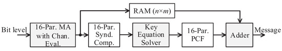 - Zhu, J.; Zhang, X. Efficient Reed–Solomon decoder with adaptive error-correcting capability. In Proceedings of the 19th Annual Wireless and Optical Communications Conference (WOCC 2010), Shanghai, China, 14–15 May 2010; pp. 1–5. [Google Scholar] [CrossRef]