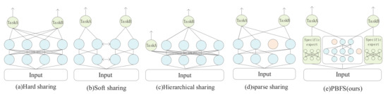 The hierarchical sharing [10,11] in Figure 1c considers the progressive relationship between tasks, which means that task A may be a subtask of another one, thus placing them on different network layers. The sparse sharing mechanism [12] in Figure 1d is based on the idea of the lottery ticket hypothesis, which argues that in any dense base network, an optimal subnet could be found for each task to learn the required information. Since the same base network is used, different tasks will automatically select the information through IMP (iterative magnitude pruning).