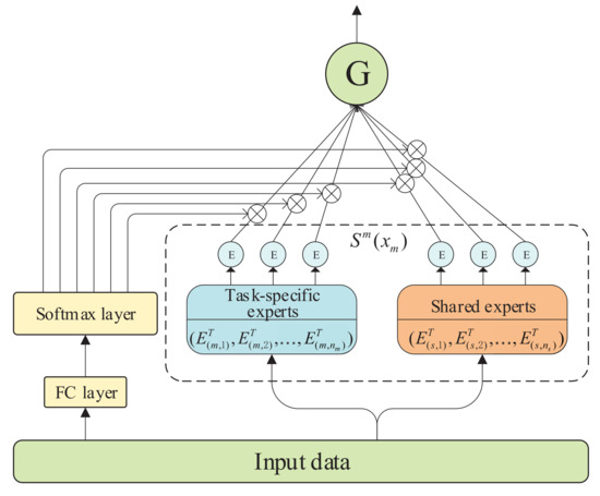 where is the input of task m, represents the weighting function to calculate the weight vector of task m through linear transformation and softmax activation function, is a united matrix made up of all output vectors, including task m’s specific experts and shared experts, and their calculation formula is given as follows: